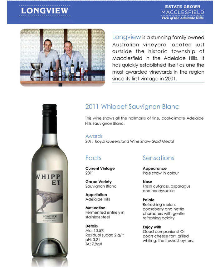 PIRRAMIMMA WINERY 2011 Stocks Hills Sauvignon Blanc Semillon CORIOLE VINEYARDS 2011 Chenin Blanc LONGVIEW 2010 Bluecow Chardonnay